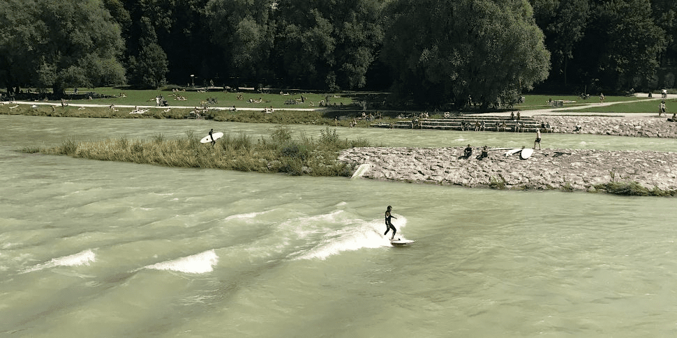 München genießt den Ruf als Weltstadt des Flusssurfens. Die berühmten Wellen des Eisbachs ziehen Regisseure, Werbeschaffende und Touristen aus aller Welt in die bayerische Hauptstadt. Im Gegensatz zum Meer, wo Surfen oft von Gezeiten und saisonalen Wetterphänomenen abhängt, ist Flusssurfen in München an bestimmten Stellen das ganze Jahr über möglich.