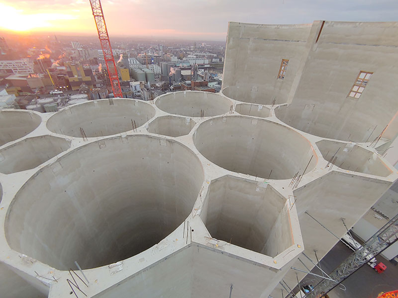 Auch im Osten Münchens, rund um den Ostbahnhof, werden alte Industriegebäude und Silos neu genutzt. Ein Beispiel ist das Werk 4 – ein ehemaliger Kartoffelsilo der Pfanni-Fabrik. Die Außenhülle blieb erhalten, im Inneren entstanden Hostel und Hotel. Höhe: 86 Meter, Fertigstellung 2020. Ein weiteres Projekt ist Optineo: Auf dem früheren Optimol-Gelände steht heute ein 65 Meter hoher Bürokomplex mit Dachterrassen und einer Fassade, die Geschichte und Moderne verbindet.