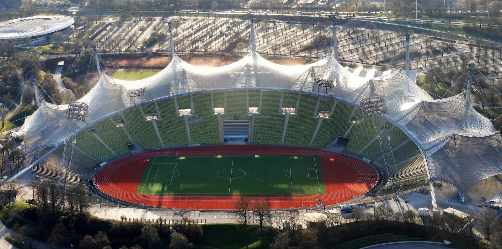 Олімпійський стадіон («Олімпіаштадіон») – це осередок спортивних здобутків, місце проведення змагань і культурних заходів. Стадіон розташований у центрі парку та привертає увагу своїм шатровим дахом, який на час відкриття стадіону вважався архітектурною сенсацією. Цей дах об’єднує стадіон, доріжки й басейни, а розробляли його, використовуючи комп’ютеризовані математичні процедури. Прозора поверхня уможливила трансляцію літньої Олімпіади 1972 року на телебаченні в кольорі, що тоді було новинкою. Така трансляція потребувала великої кількості світла, чому би не сприяла дерев’яна чи бетонна конструкція. Починаючи з 2005 року, стадіон приймає Air & Style – європейські змагання зі сноубордингу.