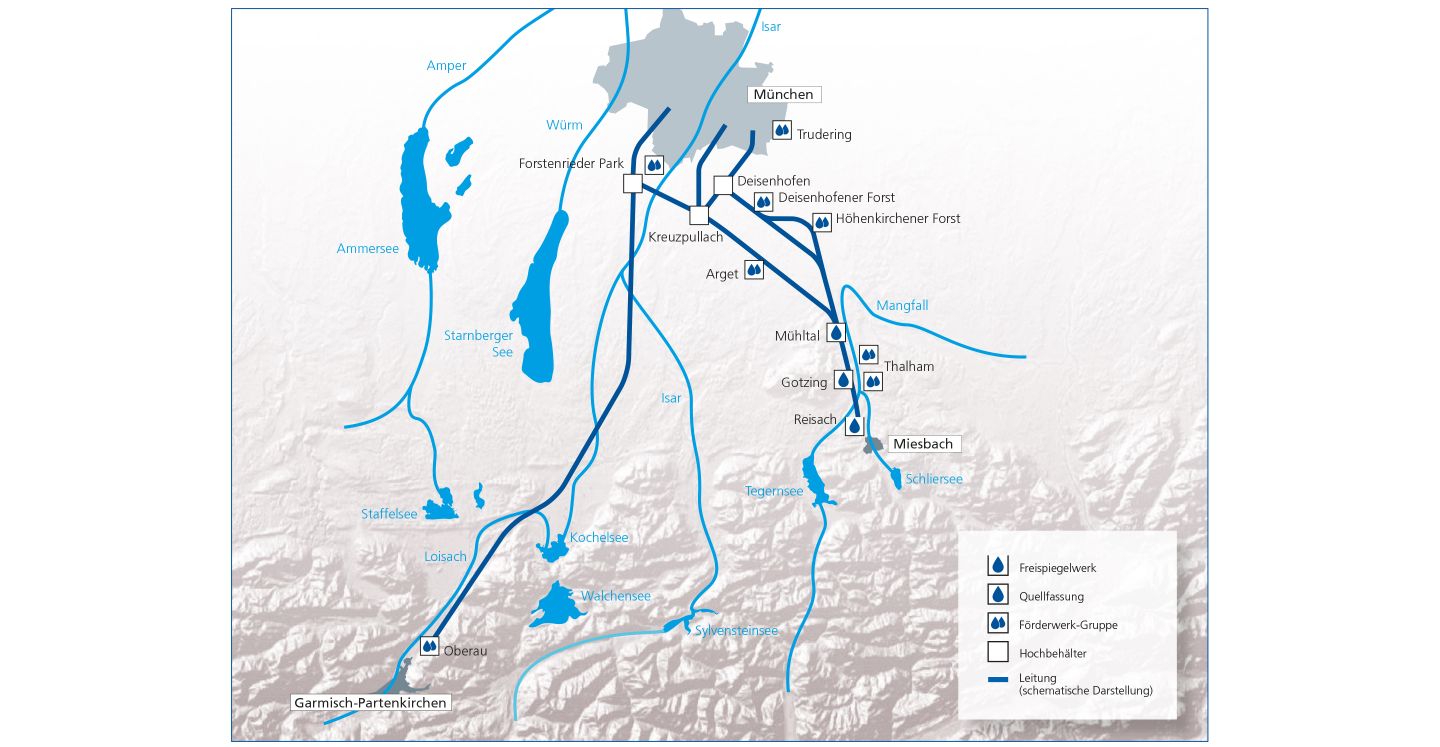 Ці системи розумно доповнюють одна одну, доставляючи одну з кращих питних вод у Європі прямо з передгір’я Альп, і до кожного дому в Мюнхені.